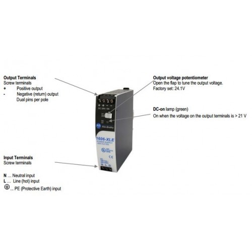 The Allen Bradley 1606-XLE power supplies are cost optimized power supplies without compromising quality, reliability and performance. The Allen Bradley 1606-XLE240E is part of the Allen Bradley XLE power supply family, existing alongside the high featured XLS family. The Allen Bradley 1606-XLE includes all the essential basic functions and the devices have a power reserve of 20%. This extra current may even be used continuously at temperatures up to +45°C. The most important features if this Allen Bradley power supply are the small size, the high efficiency and the wide temperature range.