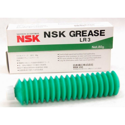 NSK GREASE LR3 contains a special synthetic oil for high temperature and stability, and a carefully selected antioxidation agent. This grease dramatically increases lubrication life under high temperature conditions.